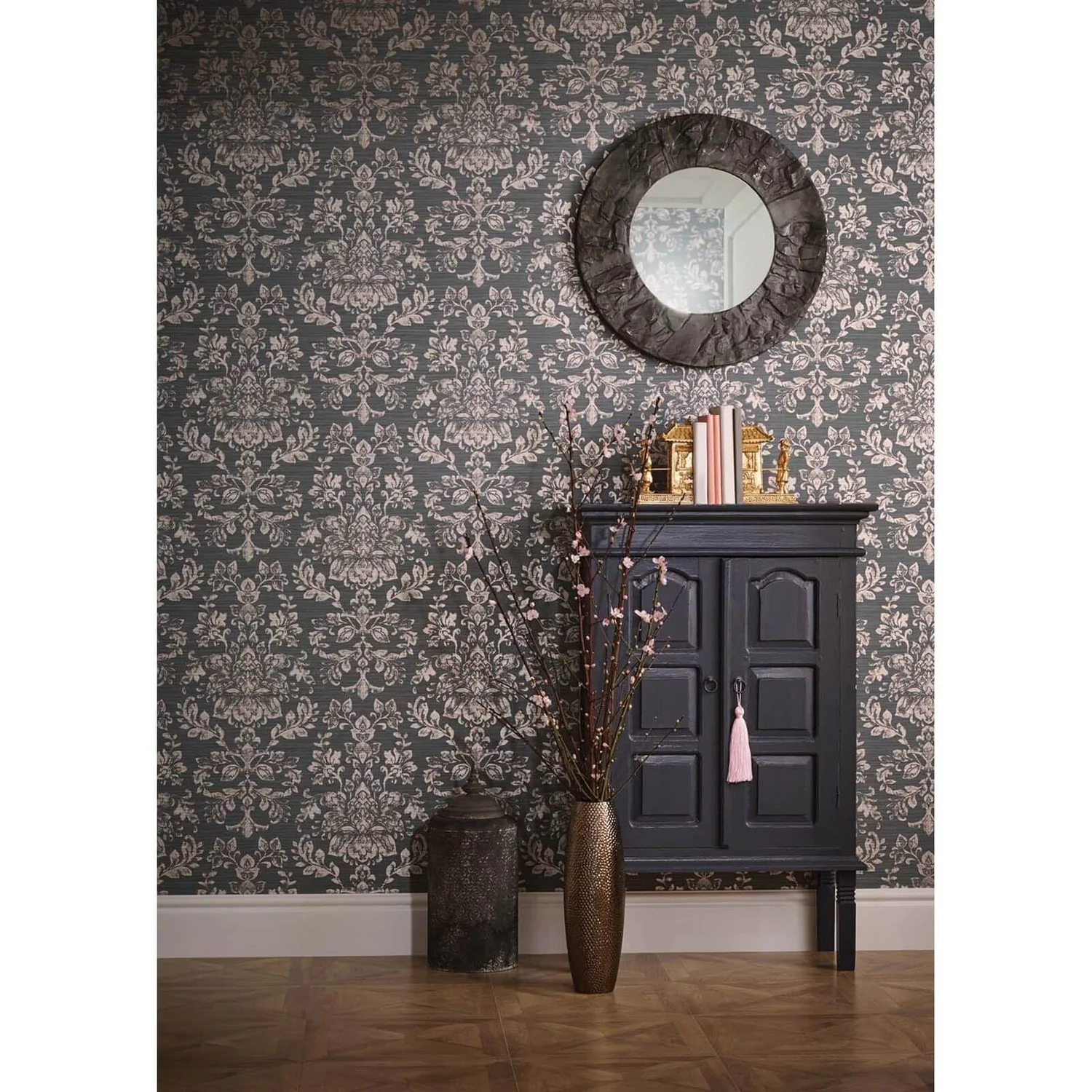 Arthouse Kyasha is a truly mesmerising wallpaper. It takes inspiration from Eastern gilded temple roofs. This rose gold damask design shimmers with intricate detail and brightly distressed metallic foil motifs. It sits on a charcoal grey background and features a distressed look to add an elegant touch. It would make an eye-catching hallway wallpaper or an intriguing lounge choice.