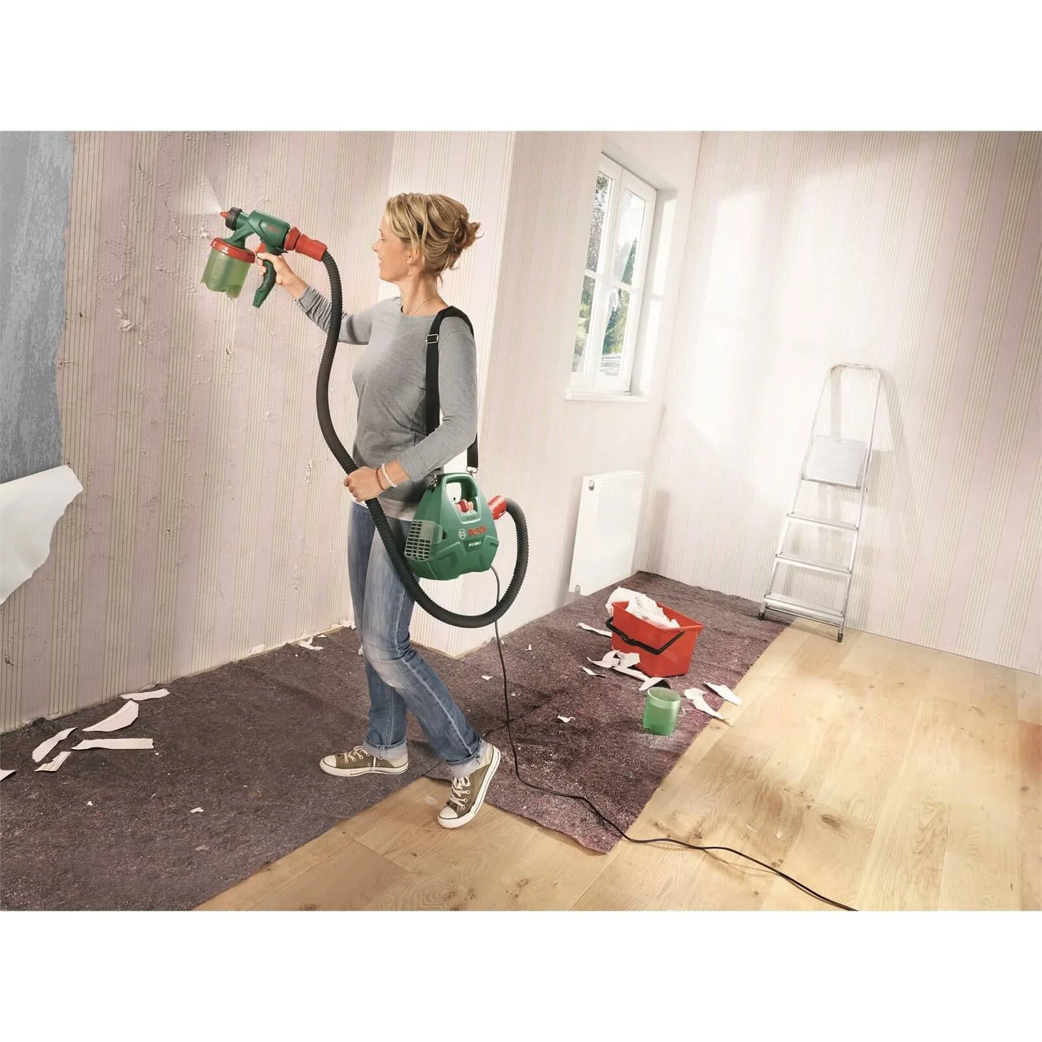 The Bosch PFS 3000-2 All Paint is the perfect paint spray gun for medium to large indoor and outdoor paint projects. If you are looking for a really clean even application of paint onto walls, furniture or even textured surfaces and are keen to complete your paint projects as quickly as possible, then try this. The added bonus is it leaves no brush strokes. What’s more it delivers really quick results covering an area of 2 square metres per minute. So if you are looking to freshen up garden furniture (whicker or other), wooden doors, walls fast… It comes with a nozzle that allows you to use varnish, glaze and emulsion paint. Check the instructions on which nozzle to use, and how to dilute the paint to the correct consistency for optimum results.