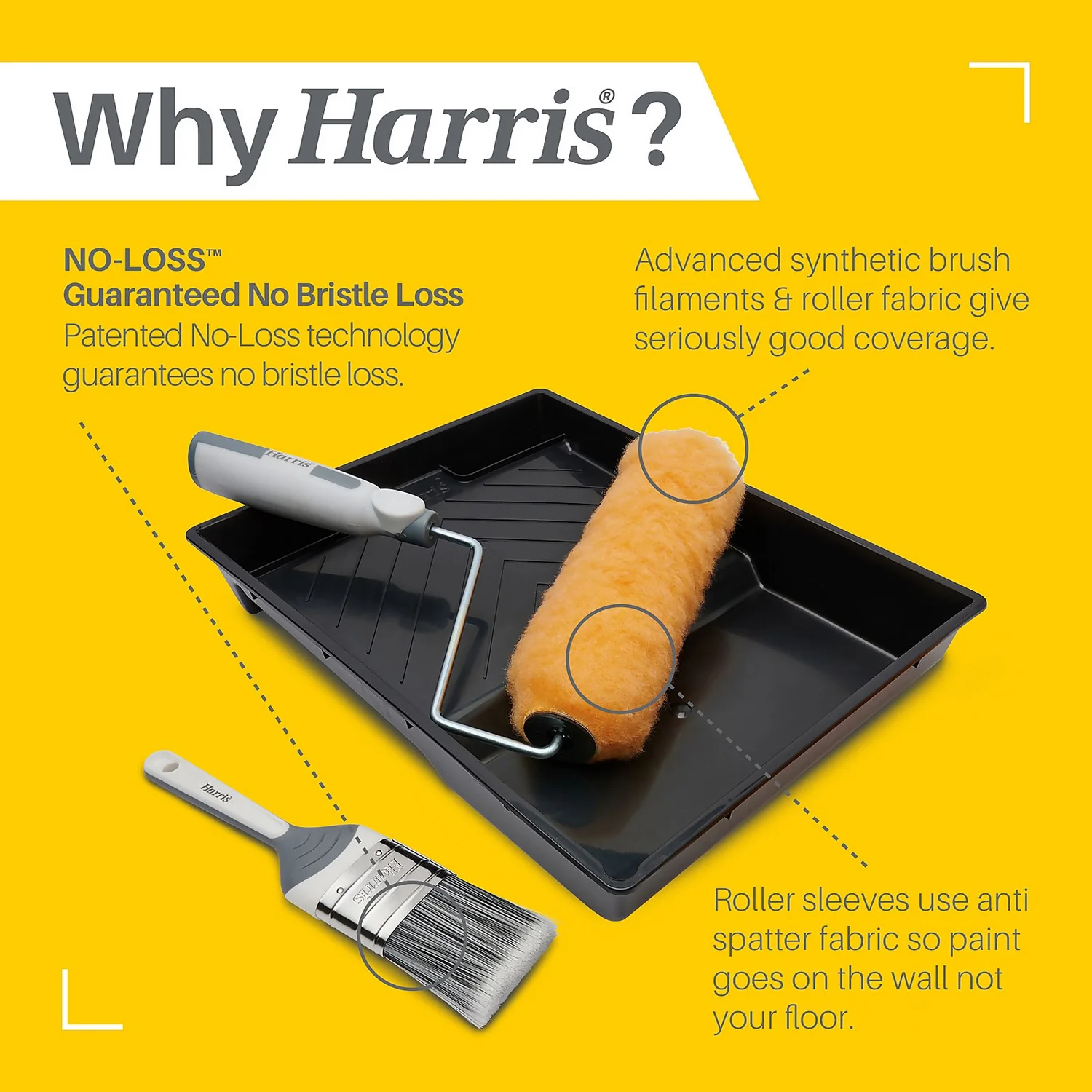 The deep tick pile of this roller set use splatter control technology in the roller fabric, so more paint goes on your walls, leaving you with less mess at the end of the day. Get more reach on high brick walls with the compatible Harris Seriously Good Extension Pole.